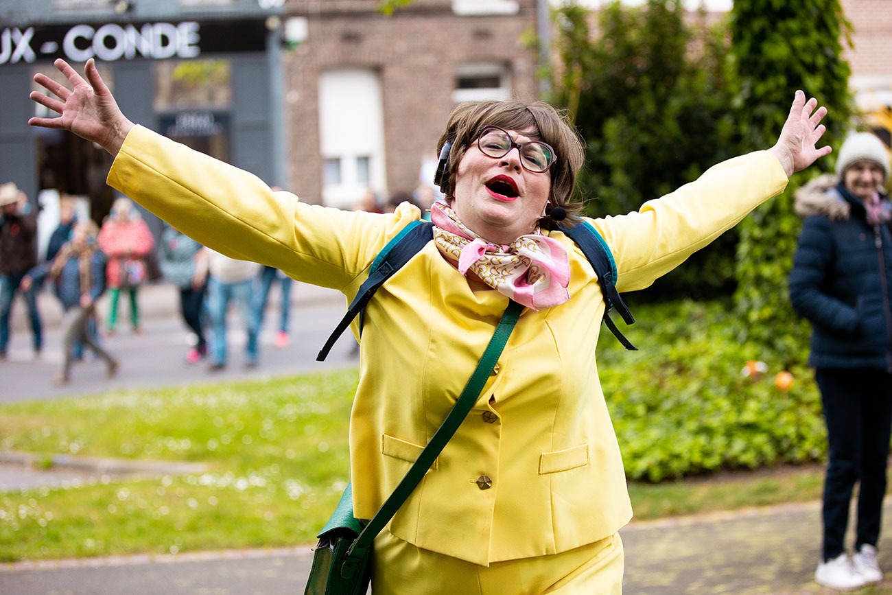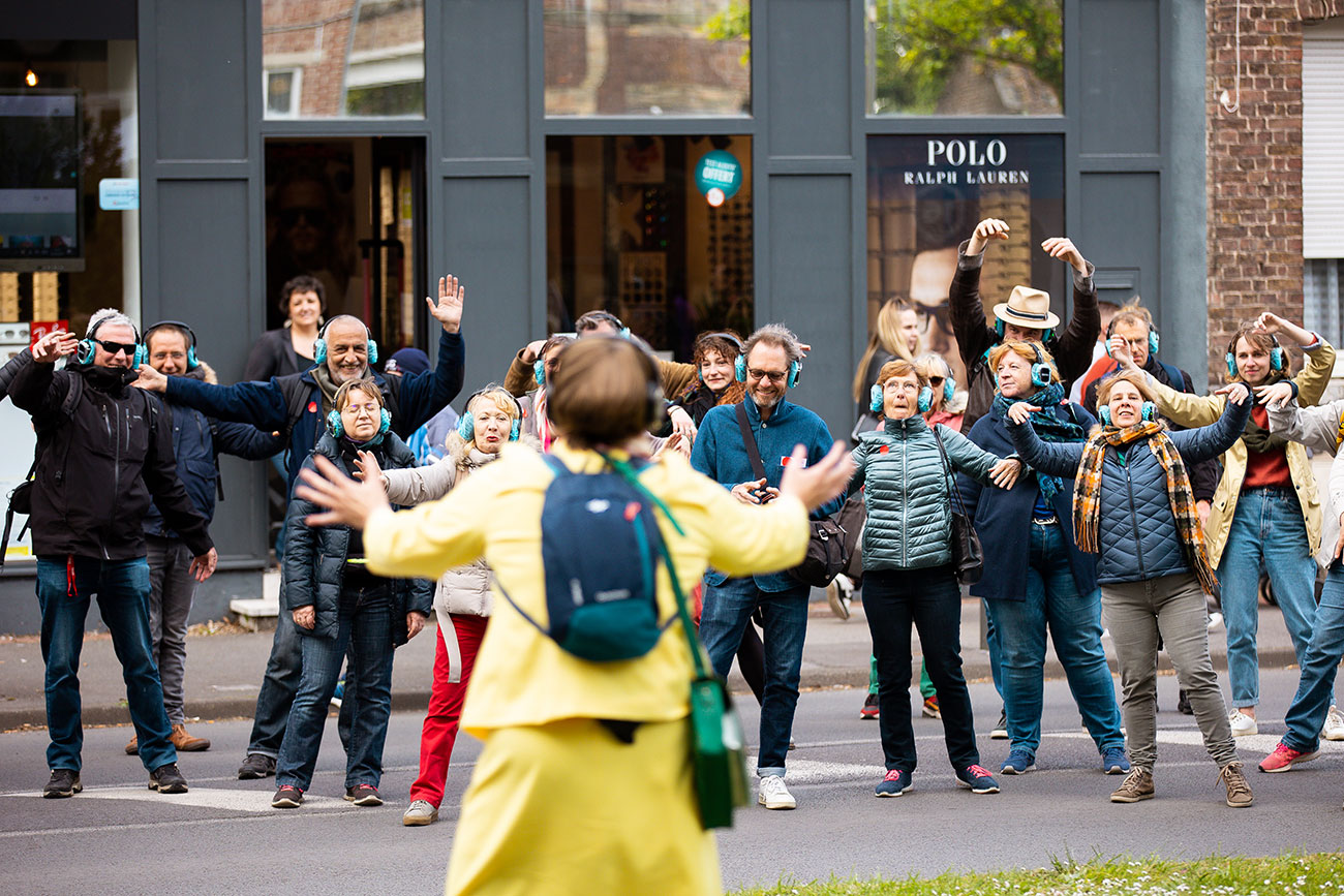« Coupé du monde » par des casques audio pour naviguer dans un monde chanté, murmuré, raconté par Lucy Martin, un groupe déambule en silence, danse, en formation autocar ou en file indienne. Ce groupe ondule dans le calme tandis qu’autour, des passant.e.s intrigué.e.s observent cette danse silencieuse et incongrue.
