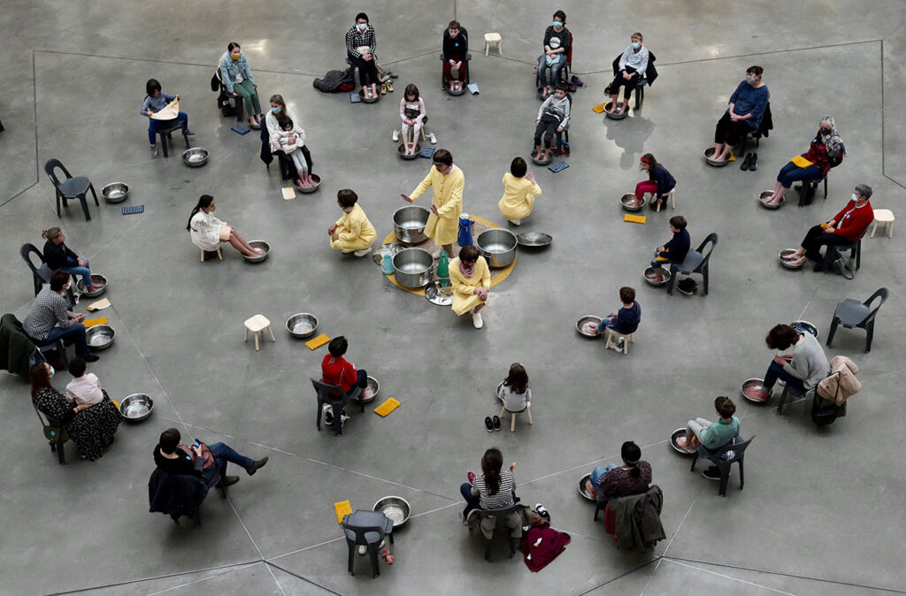 Les spectateur.rice.s sont accueilli.e.s puis réparti.e.s en 3 groupes de 30 personnes.
